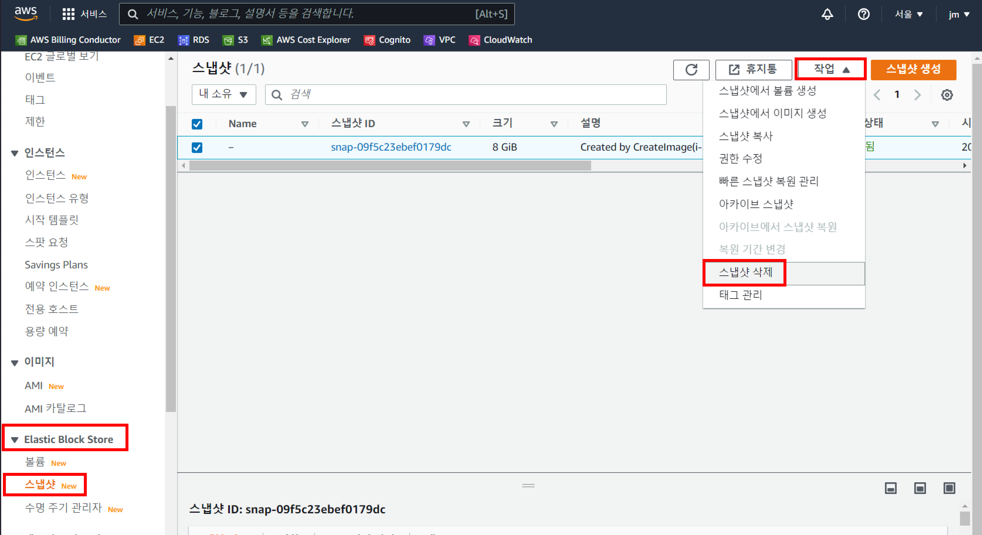 우선 AMI로 간 후에, 작업 → AMI 등록 취소를 누른다.