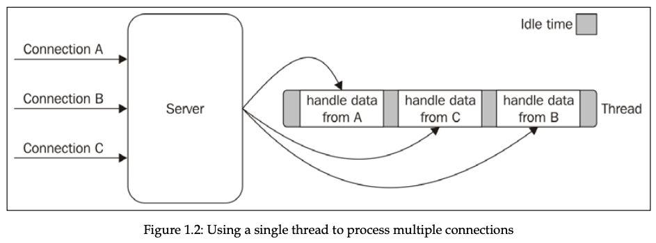 그림에서 보여주듯이 오직 하나의 스레드 만을 사용한 것이 동시적 다중 I/O 사용 작업에 나쁜 영향을 미치지 않습니다.