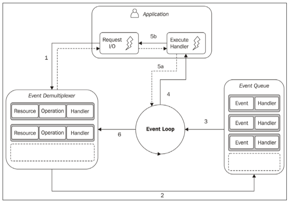 - 애플리케이션은 이벤트 디멀티플렉서에 요청을 전달함으로써 새로운 I/O 작업을 생성합니다.